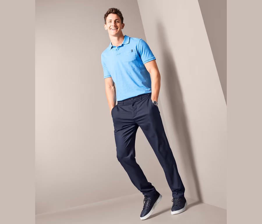 Diese Hose kombiniert den klassischen Look einer Chino mit bequemem Komfort. Ob sportlich oder elegant – dank recyceltem Polyester genießt man optimale Bewegungsfreiheit. Das leichte und dehnbare Material sorgt für einen hohen Tragekomfort. Die dunkelblaue Herrenhose hat einen Komfortbund und ist mit zwei Eingrifftaschen sowie zwei Gesäßtaschen mit Knopf ausgestattet.