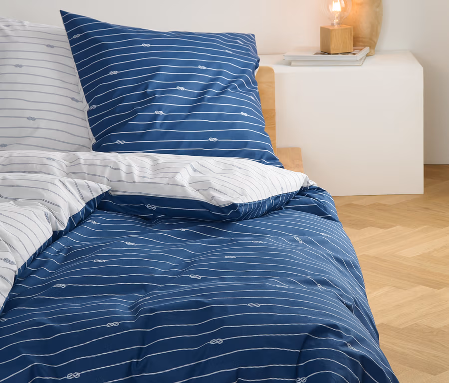 - 1 Seite blau mit weißem Seil-Print, 1 Seite weiß mit blauem Seil-Print