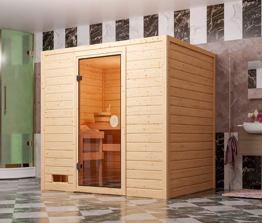 - Hochwertige Massivholzsauna aus vorgefertigten Wandelementen