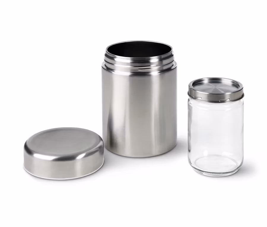 - Glasbehälter transparent mit edelstahlfarbenem Deckel