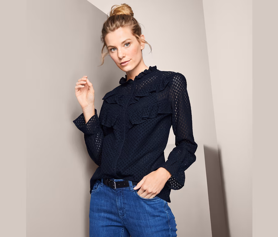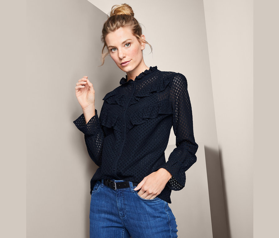 Diese Bluse bekommt durch ihre gehäkelte Verarbeitung eine angenehm leichte Optik. Der kleine Stehkragen sorgt mit seiner Rüschenborte im Zusammenspiel mit den eingesetzten Falten an den voluminösen Ärmeln und dem elastischen Ärmelabschluss mit angesetztem Volant für einen romantischen Touch. Das Damenoberteil liegt mit seinem hohen Baumwollanteil angenehm weich auf der Haut und hat eine Knopfleiste sowie zwei aufgesetzte Rüschenborten.