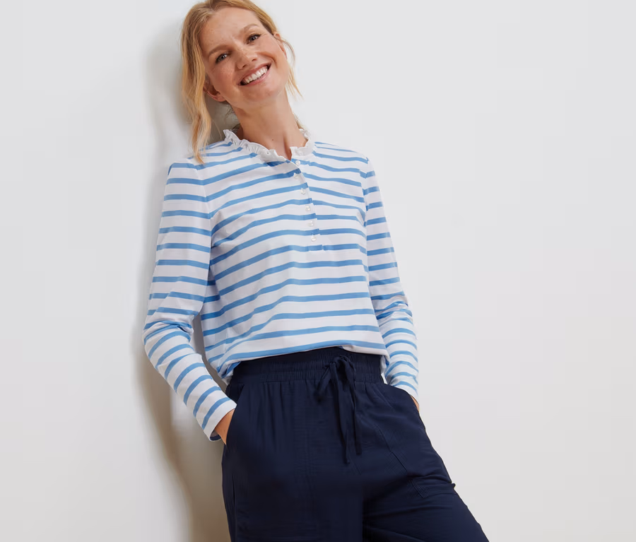 • Ausschnitt mit Knopfleiste und Rüschenkante