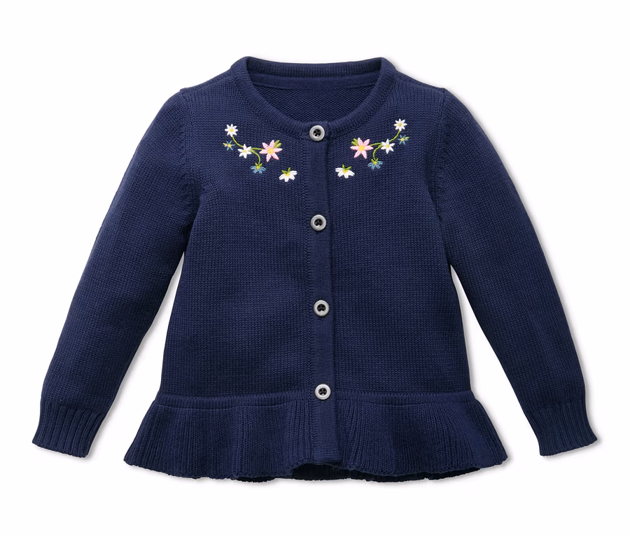 Ein Hauch von Tracht: Diese Strickjacke für Kinder wird am Halsausschnitt geziert von einer aufwändigen Stickerei im niedlichen Alpenblumen-Look, der Saum ist mit Volant gearbeitet. Die weiche Jacke ist mit einem hohen Anteil an Bio-Baumwolle gefertigt und kann mit hohem Tragekomfort punkten.