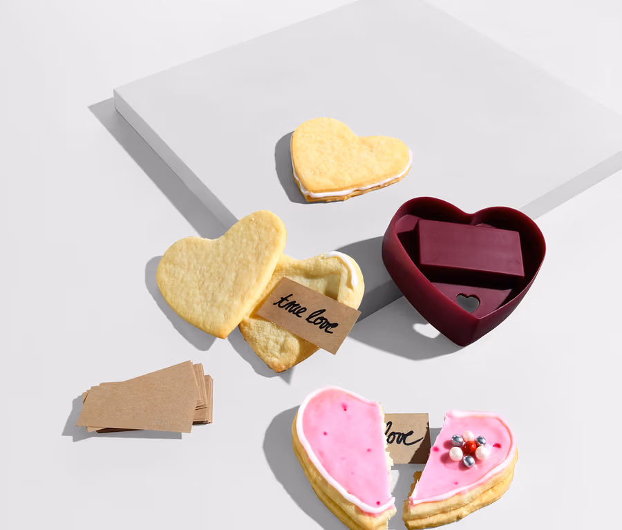 Das besondere an dem Keksausstecher ist, dass er zwei Seiten eines herzförmigen Kekses aussticht: einen Korpus mit Aussparung und einen Deckel. In die Aussparung wird je eines der beiliegenden Kraftbackpapierblätter gesteckt, das vorher individuell beschriftet oder gestaltet wurde. Jetzt müssen nur noch die beiden Hälften mit beispielsweise Schokolade oder Zuckerguss verschlossen werden – und ab in den Ofen damit. So bekommt man einen ebenso individuellen wie süßen Gruß und einfallsreicher als eine Nachricht per SMS oder Messenger ist es allemal. Ein Rezeptvorschlag zum Backen der Kekse ist natürlich auch gleich mit dabei.