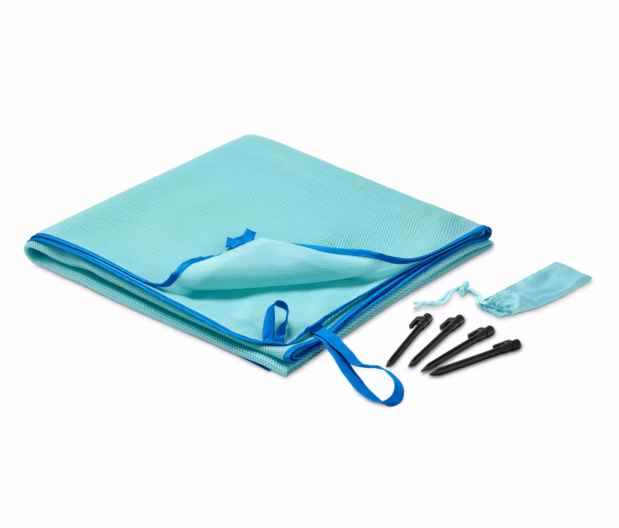 - Als Liegedecke einfach im Boden fixierbar – mit Ösen und 4 Heringen