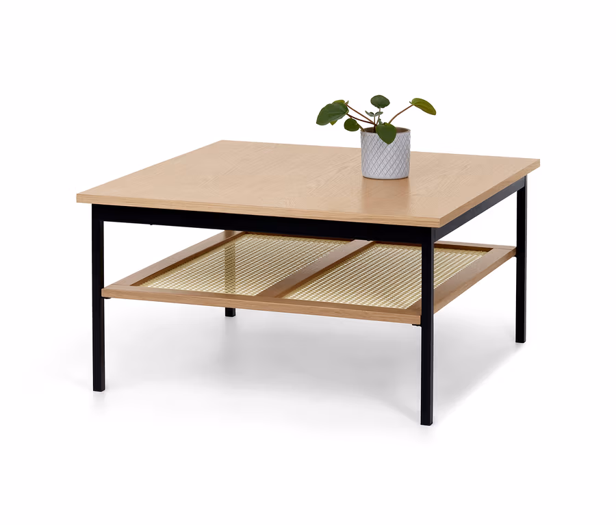 - Stylischer Holztisch mit geflochtener Zwischenablage