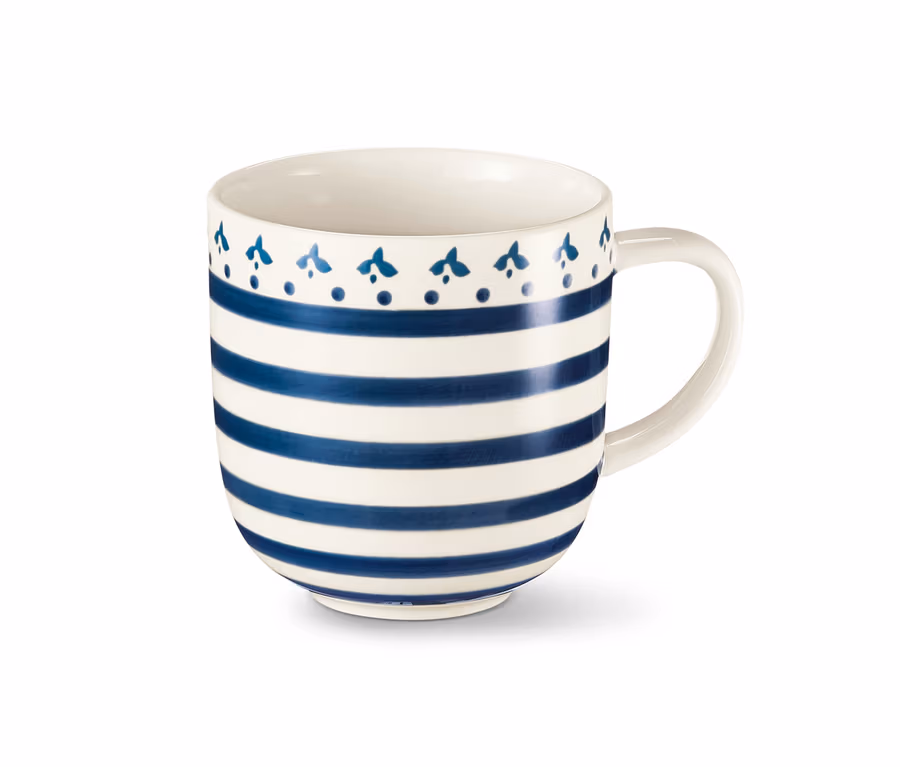 Wenn der Tag mit mediterraner Leichtigkeit starten kann, geht er doch gleich viel besser los. Dieser Becher aus hochwertiger Keramik verbreitet auf dem Frühstückstisch, auf der Kaffeetafel oder einfach zwischendurch ein sommerlich leichtes Flair – was natürlich an seinem aufwändigen, handgemalten Dekor liegt. Der Becher fasst etwa 450 Milliliter Kaffee, Kakao oder Lieblingstee – für lange Momente des Innehaltens und Genießens.