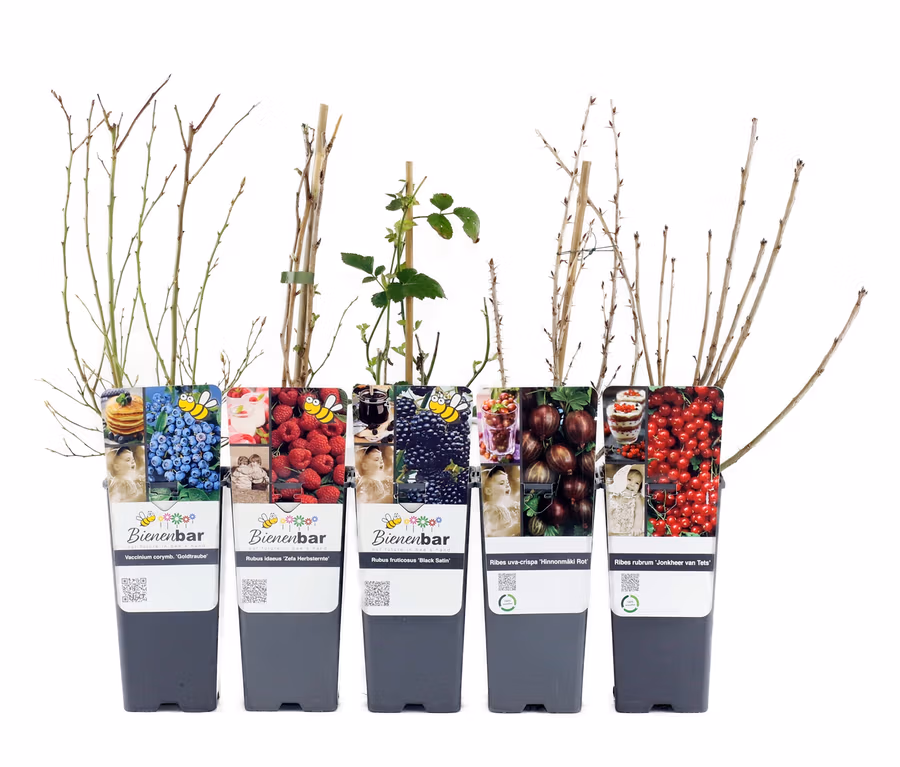 - 1x Himbeere, 1x Stachelbeere, 1x Johannisbeere, 1x Heidelbeere, 1x Brombeere