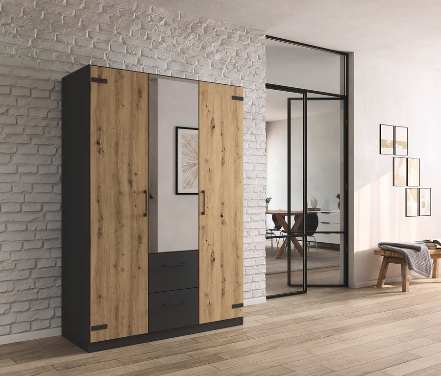 Der Drehtürenschrank Butte von rauch überzeugt in seiner angesagten Optik im Industrial-Look. Die Oberflächen in dunklem Graumetallic werden bei dem Schlafzimmer Butte mit attraktivem Eichenholzdekor kombiniert. Komplettiert wird der raue Style mit ansprechenden Applikationen in Graumetallic: formschöne Metall-Griffe sowie Türscharnier-Applikationen werden zum Hingucker. Der Kleiderschrank bietet Ihnen jede Menge Stauraum für Kleidung und Co. Öffnen Sie die Drehtüren des Schrankes haben Sie Ihren kompletten Schrankinhalt im Blick. Die Innenausstattung, bestehend aus Fachboden und Kleiderstange, können Sie in der Höhe variabel einsetzen und durch weiteres Zubehör optional nach Ihren persönlichen Bedürfnissen ergänzen. Zwei Schubladen sind in die Schrankfront integriert. Optional kann der Kleiderschrank durch weitere Möbel der Serie Butte ergänzt werden.