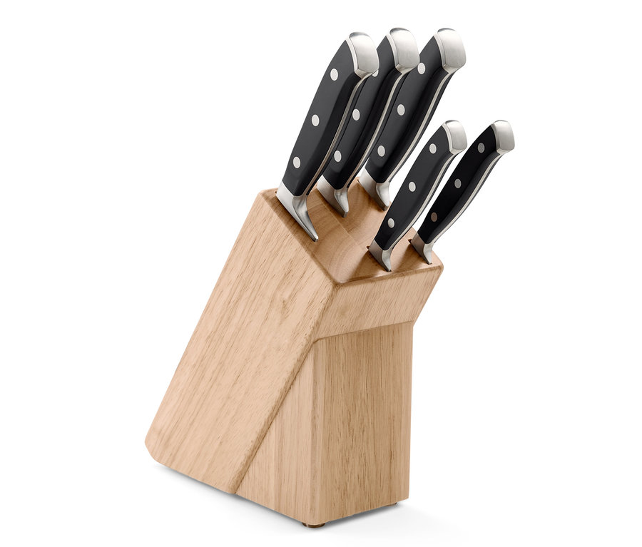 Bei manchen Messern hat man das Gefühl, man würde versuchen, mit Löffeln zu schneiden. Mit diesem Messerset der Extraklasse bekommt man das Gefühl dafür zurück, was Kochen wirklich ausmacht: Spaß am Produkt und an der präzisen Zubereitung. In dem Messerblock aus lackiertem Holz stecken fünf Messer, die alle wichtigen Zubereitungsfelder abdecken.