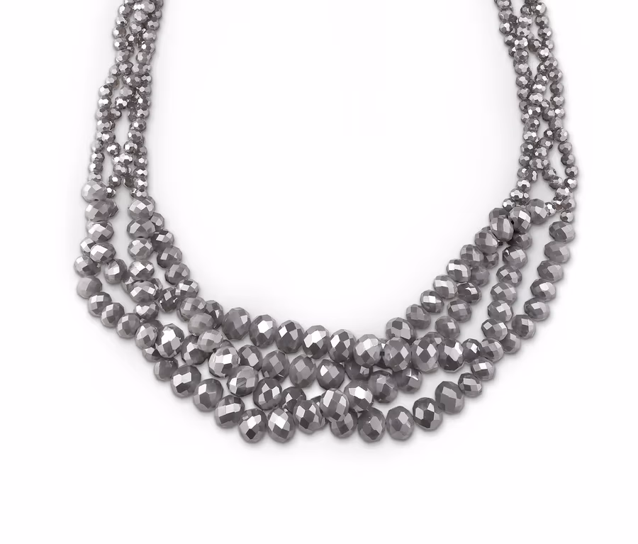 Diese opulente, viersträngige Kette beeindruckt mit unzähligen, verschieden großen Glassteinchen. Die dunkle Farbe und das dezente Funkeln der Schmucksteine geben ihr gleichzeitig etwas Geheimnisvolles.