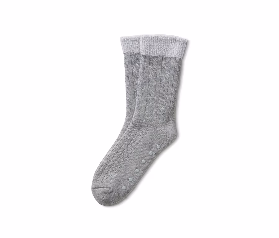 Sind es Hausschuhe, sind es Socken? Es sind Hausschuhsocken! Diese kuschelig weichen Allrounder wärmen mit ihrem flauschigen Plüschfutter nicht nur die Füße von innen, sondern können sich mit dem dekorativen Zopfstrickmuster auch von außen sehen lassen. Durch das weiche Plüsch-Bündchen schnüren die Socken nicht ein, das formbeständige Elasthan sorgt zudem für einen hohen Tragekomfort und perfekten Sitz. Für den nötigen Halt der Hausschuhsocken sorgen die Antirutsch-Noppen sowie die verstärkte Spitze und Ferse.