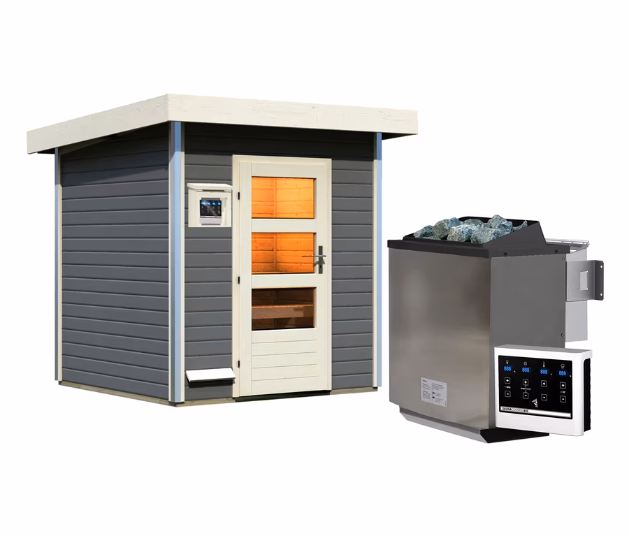 - Inkl. 9-kW-Bio-Ofen, Steuergerät »Easy Bio«, Saunasteinen, Kabel, Farblichtanwendung, Kopfstütze, Zubehör-Set Classic, Bluetooth®-Lautsprecher Premium, Klimamessstation Premium, Geschenkpackung, selbstklebender Dachfolie, Schrauben und Beschlägen