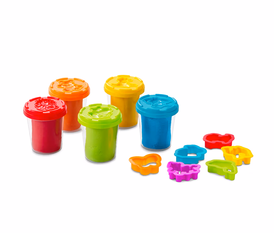 - 5 Töpfe à 140 g Knete in verschiedenen Farben – mit 2D-Motiven im Deckel