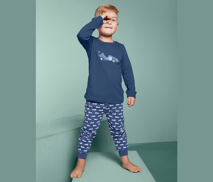 Der Schlafanzug ist mit formstabilen Rippbündchen an Halsausschnitt, Arm- und Beinabschluss, die Hose hat zusätzlich einen verstellbaren Gummibund für einen perfekten Sitz. Von Größe 74/80 bis 86/92 lässt sich der Zweiteiler für ein besonders leichtes An- und Ausziehen mit Druckknöpfen an der Schulter öffnen.