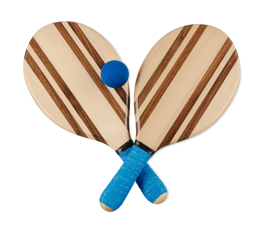 Bereit für einen kleinen Schlagabtausch? Mit diesem Premium-Beachball-Set auf jeden Fall! Es besteht aus zwei Schlägern und einem Gummiball. Letzterer kann bis zu vierzig Meter weit fliegen und auf festerem Sand springen. Der robuste, hochwertige Schläger aus Linden- und Walnussholz wird durch ein extraweiches Griffband abgerundet. Durch das höhere Gewicht liegen die Schläger zudem besonders gut in der Hand. Perfekt also für eine kleine Frescobol-Partie.