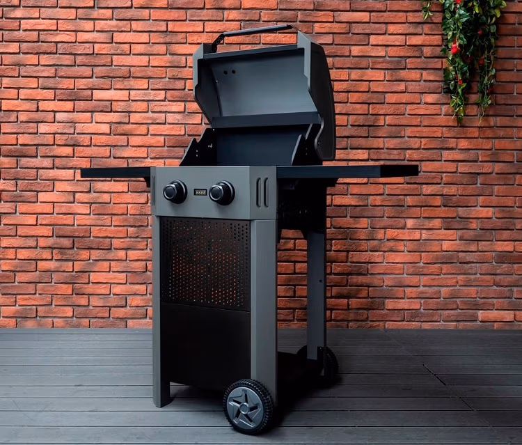 Inkl. 2 getrennt regelbaren Hochleistungsbrennern, LED-Temperaturanzeige, klappbaren Seitenablagen, 2 Rädern, emailliertem Gusseisen-Grillrost, Warmhalterost und Aufbauanleitung