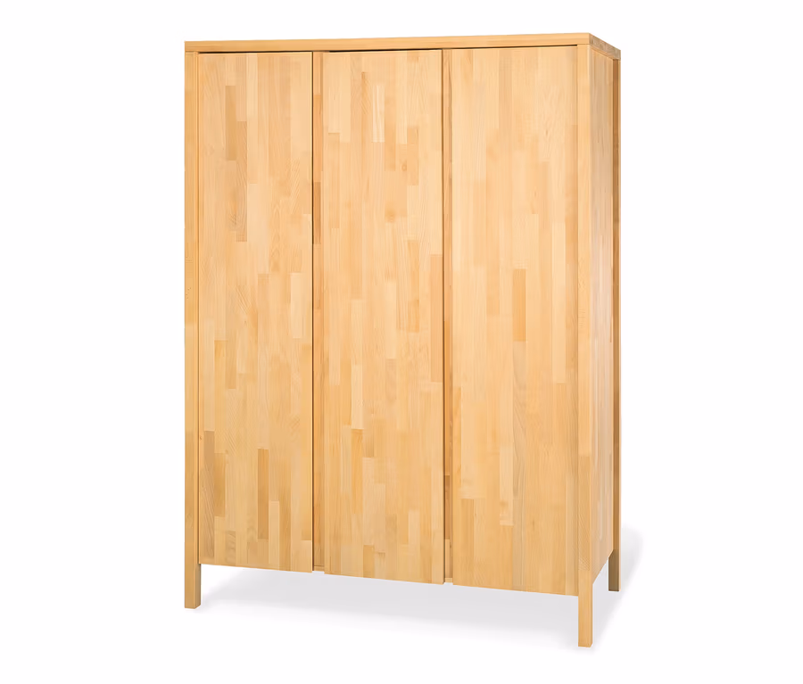 Mit seinen drei Türen bietet der geräumige Kleiderschrank jede Menge Stauraum für Kleidung, Bettwäsche, Spielsachen und alles, was sonst noch im Kinderzimmer verstaut werden muss. Die sechs Einlegeböden sind teilweise höhenverstellbar. Der Schrank ist mit Soft-Close-Beschlägen ausgestattet und ermöglicht so ein leises und sicheres Schließen. Zudem wird dadurch ein Einklemmen kleiner, zarter Kinderfinger verhindert. Der Mix aus Design und Natürlichkeit bringt eine warme und bodenständige Atmosphäre ins Kinderzimmer. Durch die sehr gut sichtbare Holzstruktur wird der Kleiderschrank zum Unikat. Die ideale Erstausstattung für das Babyzimmer – und so exklusiv bei Tchibo erhältlich.