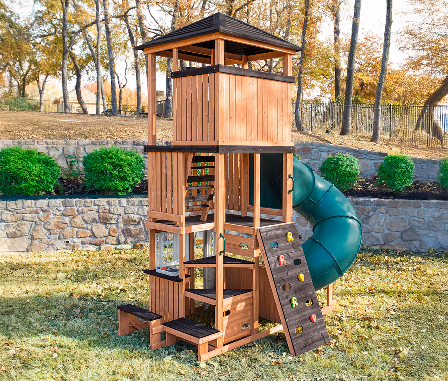 - Lassen Sie kein grobes Spielen oder eine nicht bestimmungsgemäße Verwendung der Spielgeräte zu. Das Stehen auf oder Springen von Dächern, erhöhten Plattformen, Schaukeln, Klettergerüsten, Leitern oder Rutschen kann gefährlich sein.