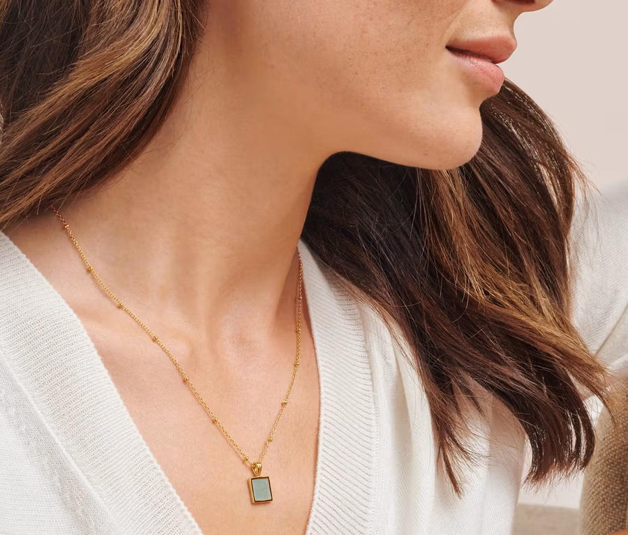 Ich mag das Design, die Kombination aus dem eckigen Anhänger und den kleinen Kugeln in der Kette. Die Kette ist etwas länger als die