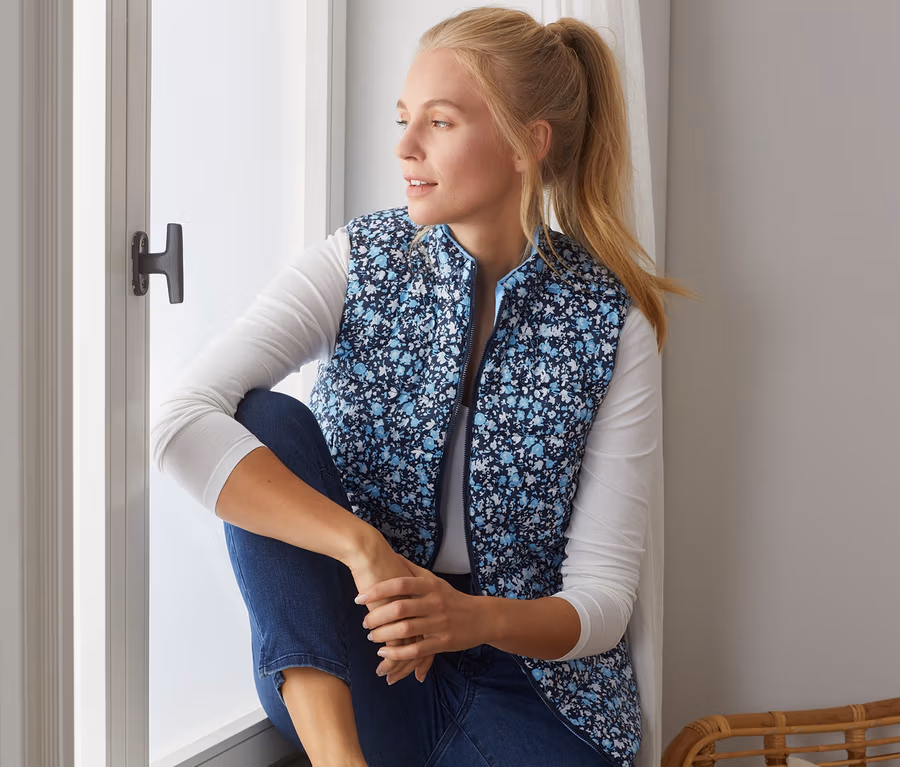 - Eine Weste, 2 Looks – eine Seite mit floralem Alloverprint, eine Seite hellblau