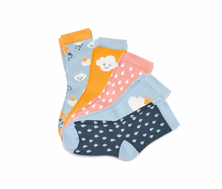 - 1x hellblau und gelb mit mehrfarbigem Alloverprint, 1x gelb und hellblau mit weißer Wolke, 1x rosa mit weißen Tropfen, 1x hellblau mit weißer Wolke und gelber Sonne, 1x schieferblau mit hellblauen Tropfen