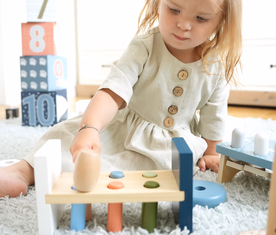 - Klopfbank mit gummierten Löchern, Hammer für Kinderhände geeignet