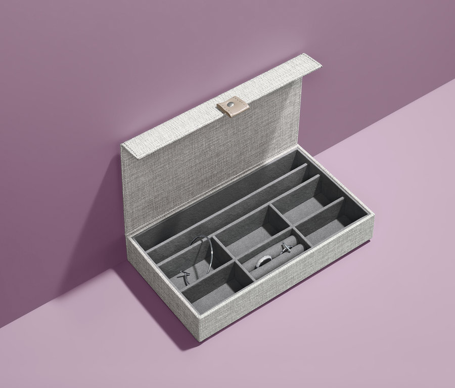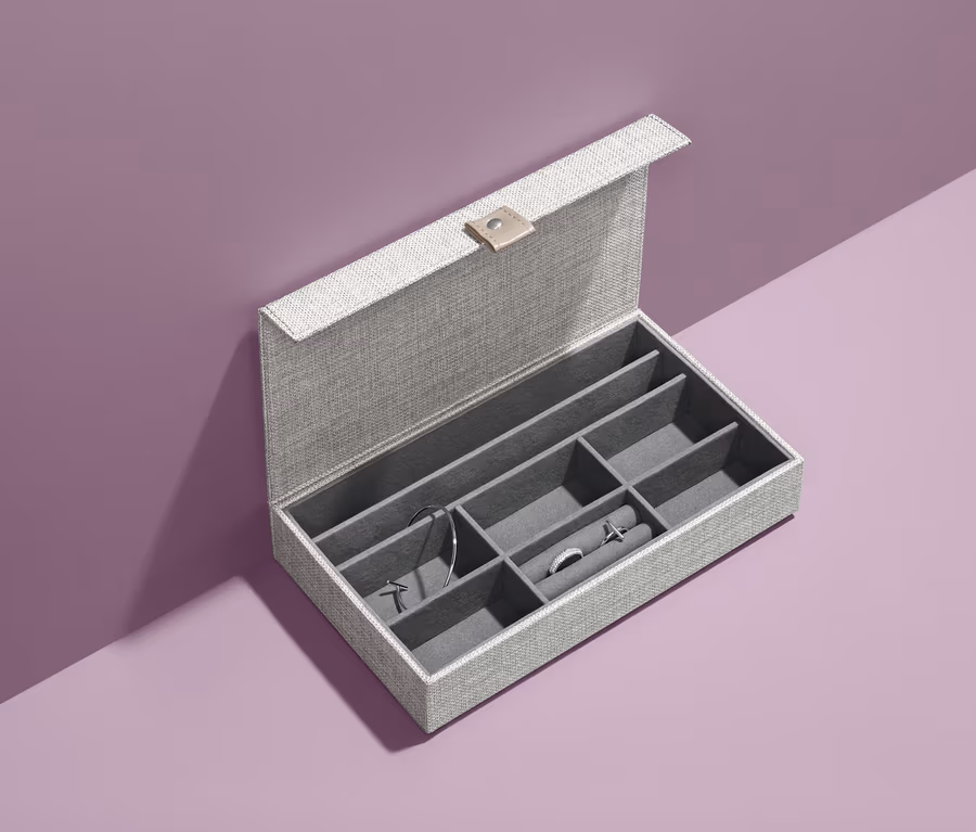 Diese Aufbewahrungsbox für Schmuck findet überall Platz, muss sich aber bestimmt nicht verstecken. In der Box lässt sich jede Art von Schmuck sortiert und griffbereit aufbewahren – und mit ihrem Leinendesign und der Öffnungslasche in Lederoptik setzt sie auch selbst einen hübschen Akzent.