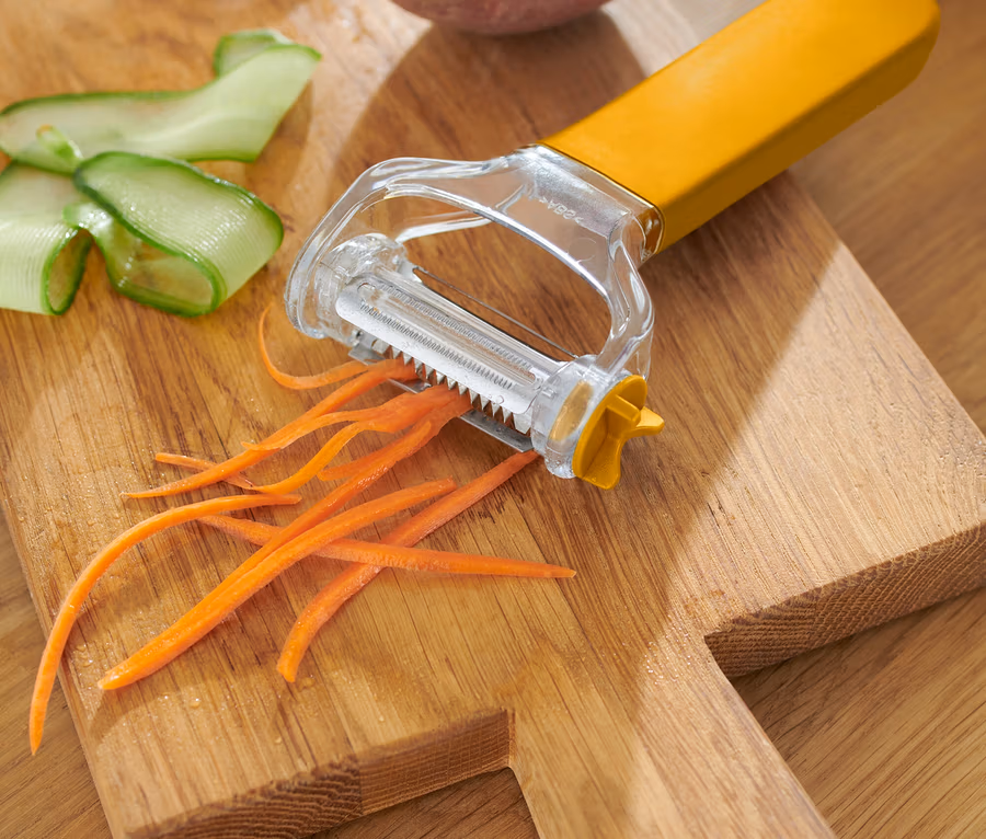 - Julienneschneider – für gleichmäßige, dünne Gemüsestreifen wie z.B. Zucchini, Karotte