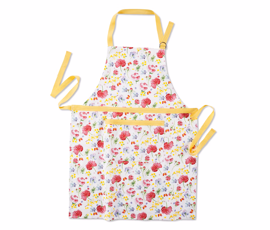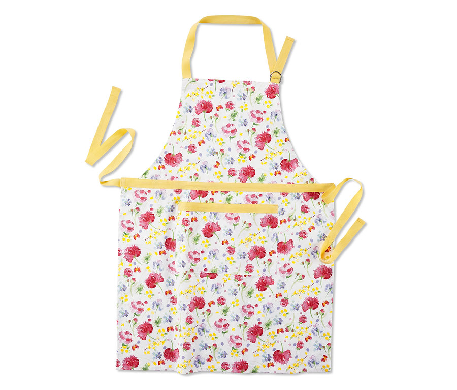 Die Kochschürze ist aus reiner Baumwolle gefertigt und lässt sich mit einem längenverstellbaren Nackenband perfekt in der Länge anpassen. Sie hat eine aufgesetzte Tasche für kleine Backutensilien und macht mit ihrem freundlichen, frühlingshaften Blumen-Alloverprint einfach gute Laune.
