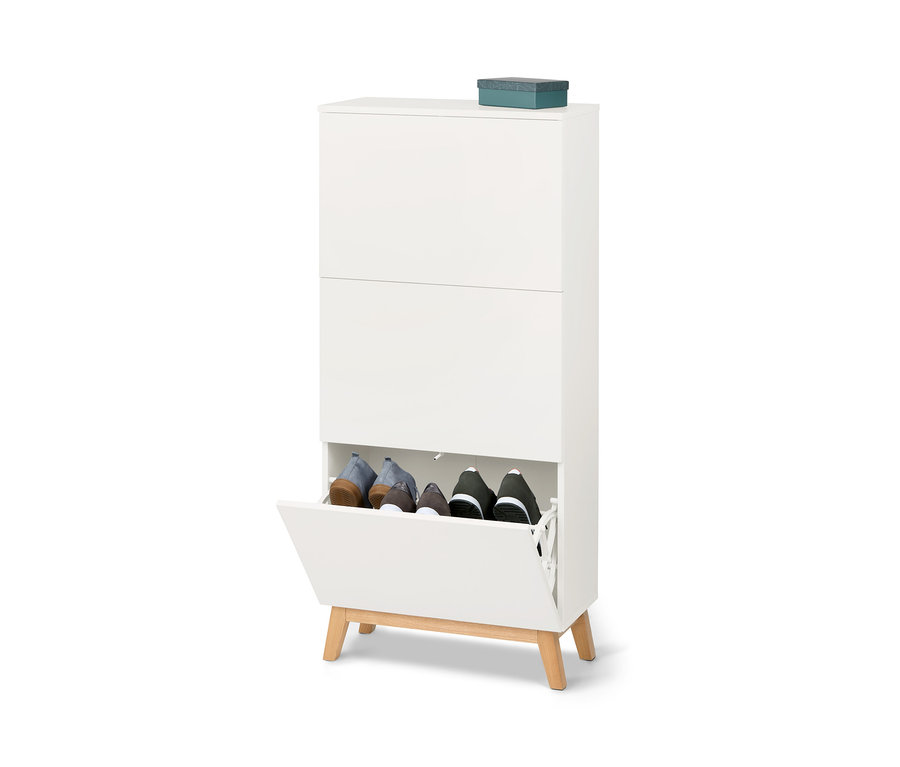 Im Flur und im Eingangsbereich ist meistens nicht viel Platz vorhanden. Aber das ist eben auch der Ort, an dem Schuhe am sinnvollsten aufgehoben sind. Dieser schmale Schuhschrank aus unserer beliebten Nordic-Serie umgeht das Platzproblem mit seinen drei kippbaren Fächern. Diese haben doppelreihige Einsätze und bieten jede Menge Platz für Schuhe bis Größe 45 – und das bei erstaunlich geringer Tiefe.