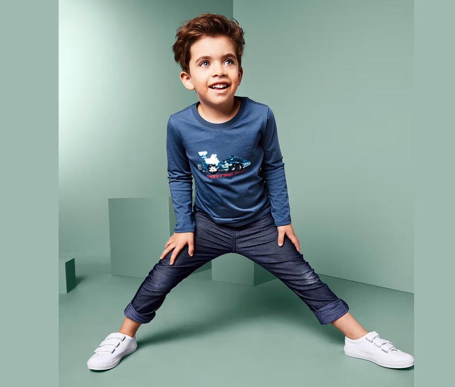 Wendepailletten sind bei den Kids der Hit – und Bequemlichkeit ist auch immer angesagt. Dieses Langarmshirt kann mit seinem coolen Auto-Print punkten, der beim Streichen über die Pailletten die Farbe wechselt. Das Motto bleibt in jedem Fall: Enjoy the trip!