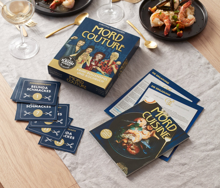 - Inkl. 6 Einladungsschreiben, 72 Anweisungskarten, Kochbuch (96 Seiten), Tischkärtchen, Schauplatzskizze