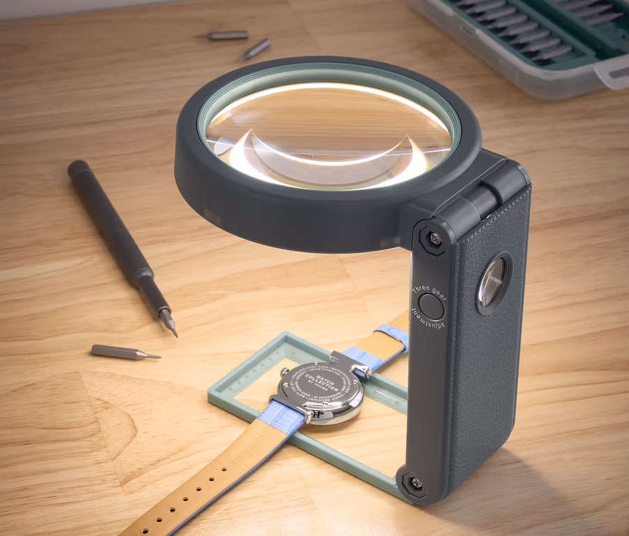 - Vergrößerung: Große Linse 2,5-fach, kleine Linse im Griff 10-fach