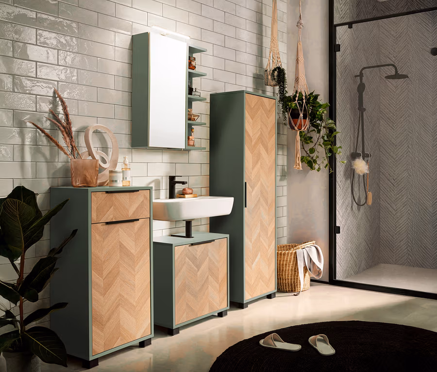 - Spiegelschrank mit Tür und 4 offenen Regalfächern