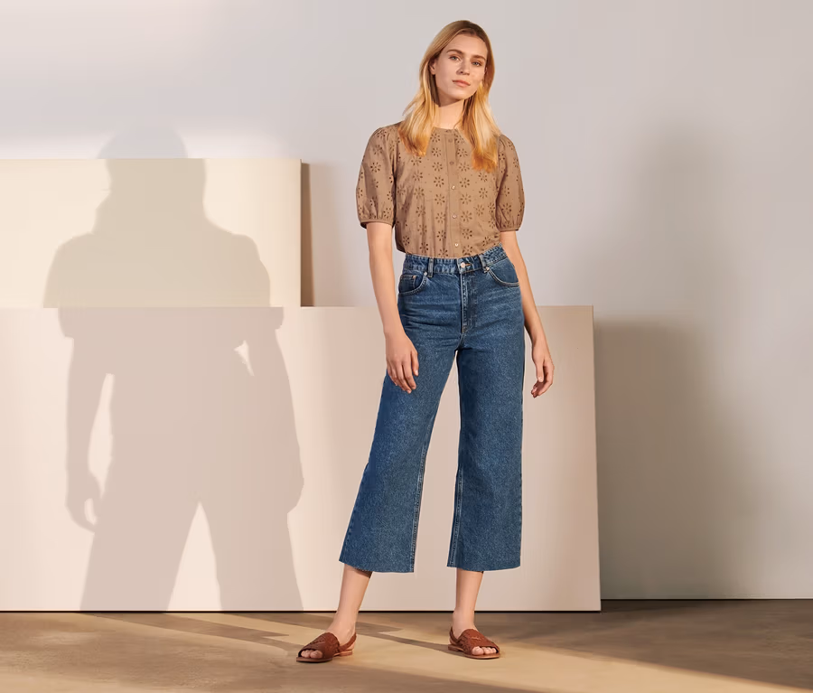 - Höher geschnittener Bund mit Gürtelschlaufen, Reißverschluss und Knopf