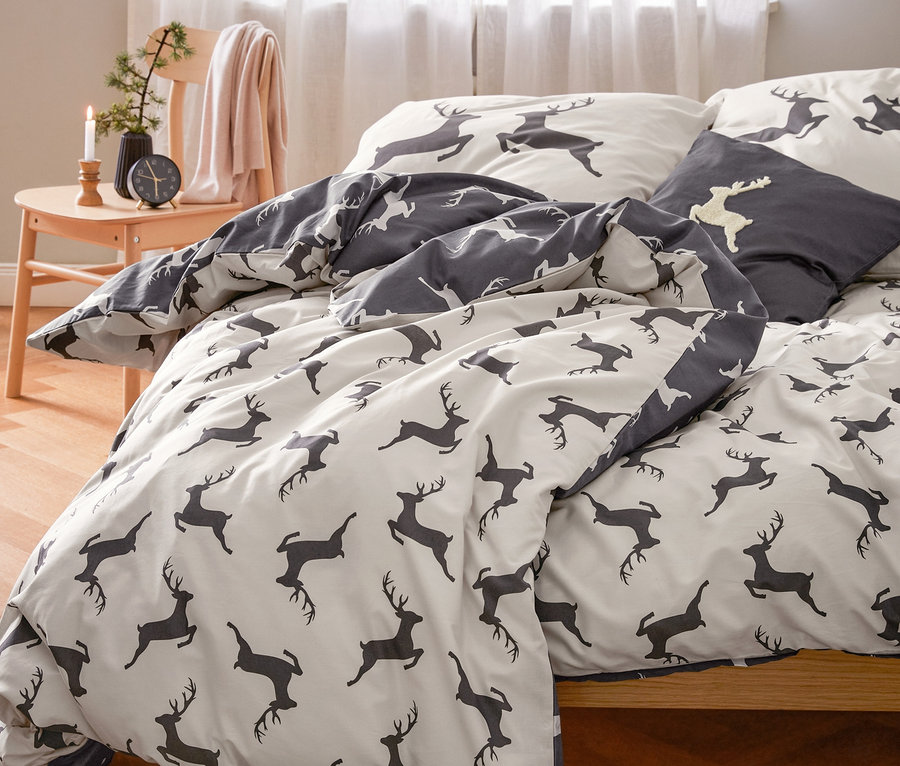 - Bettbezug 1 Seite creme mit dunkelgrauen Hirsch-Alloverprint, 1 Seite dunkelgrau mit cremefarbenem Hirsch-Alloverprint