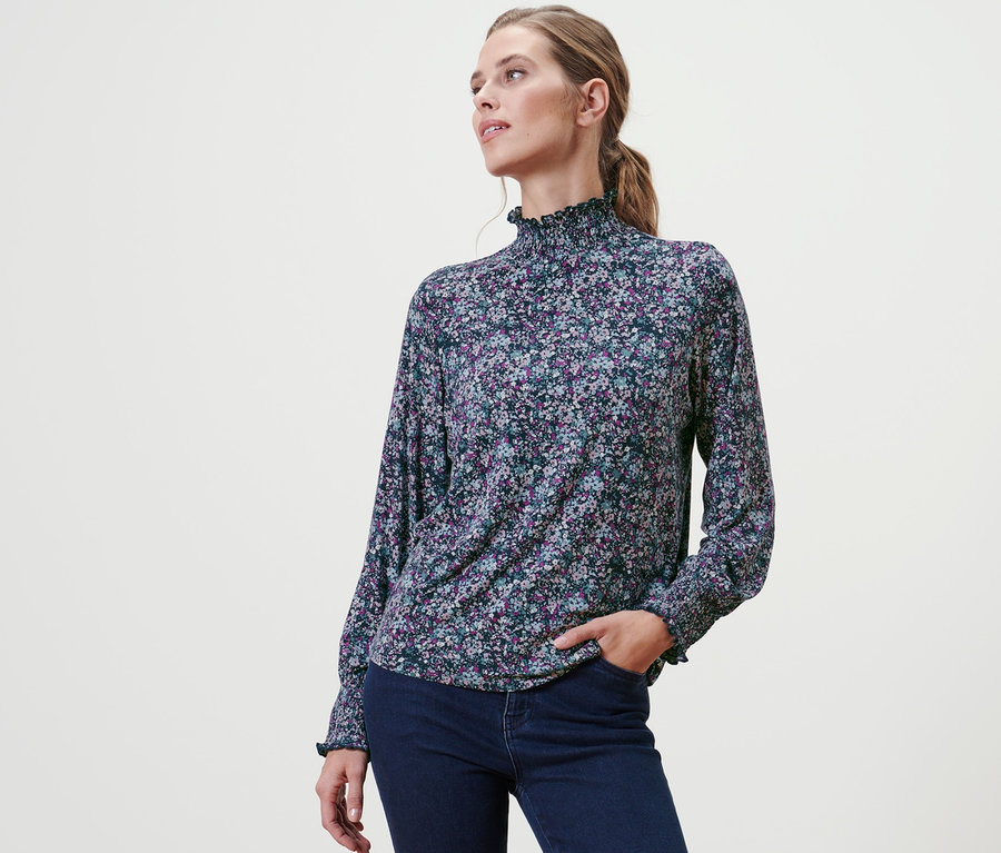 - Elastischer, gesmokter Ärmelabschluss und Stehkragen