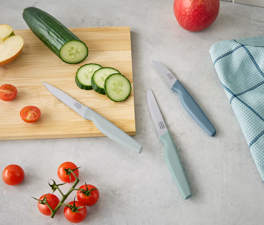 - 3 Messer für unterschiedliche Anwendungen: Schälmesser, Allzweckmesser und Tomatenmesser