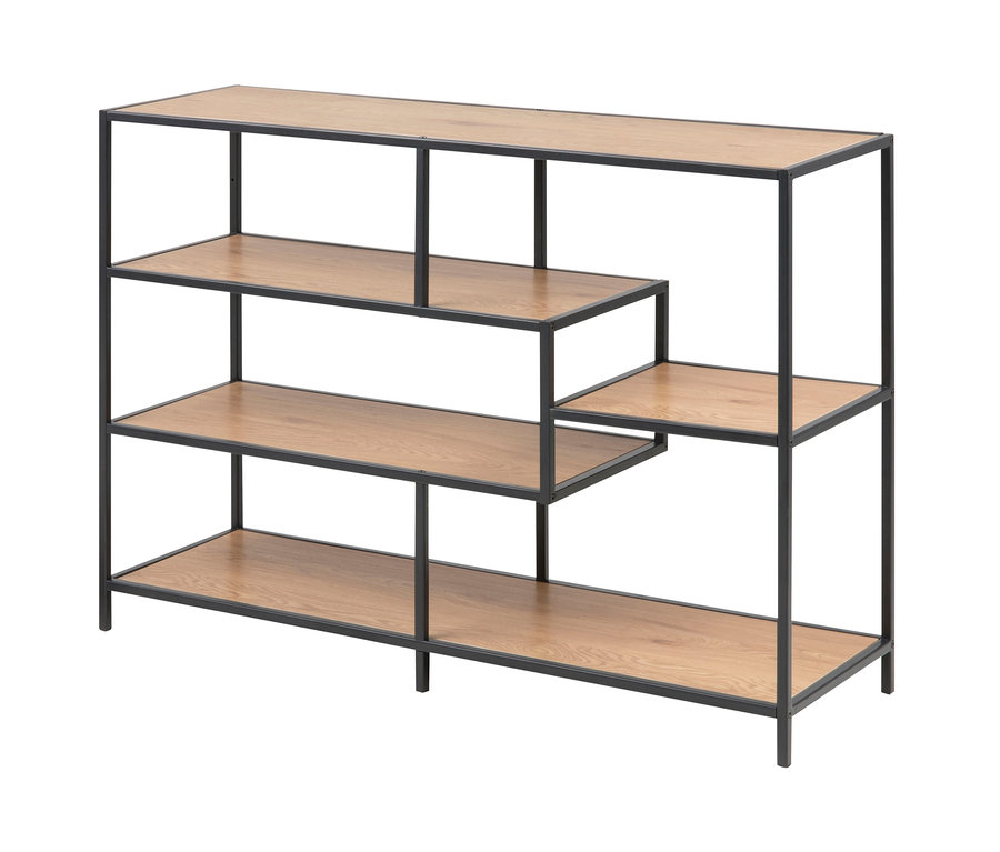 - Schlichtes, matt schwarzes Metallgestell mit 5 Regalböden in Holzoptik