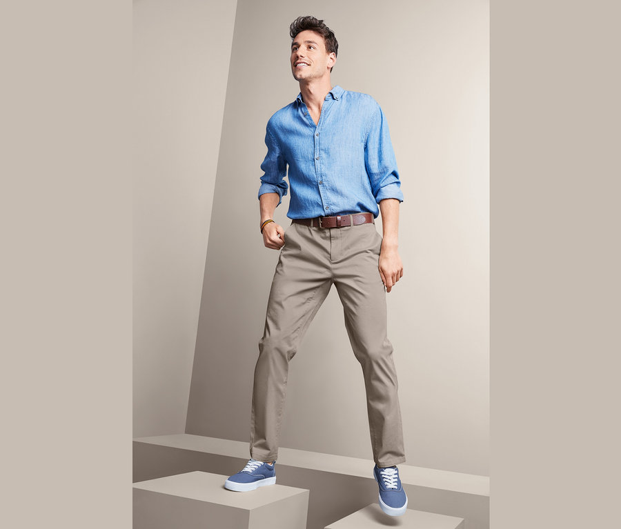 Mit Chinos ist man immer gut gekleidet und trotzdem lässig unterwegs – das macht sie zur idealen Hose für die Freizeit und ungezwungene Anlässe. Diese Herrenhose liegt mit ihrem weichen Baumwoll-Twill aus reiner Bio-Baumwolle besonders angenehm auf der Haut und der Komfortbund bietet einen perfekten Sitz. Elasthan sorgt für Formbeständigkeit und hohen Tragekomfort. Die Hose ist klassisch gerade geschnitten und mit zwei vorderen Eingrifftaschen sowie zwei Gesäßtaschen mit Knopf ausgestattet. Ihre Garment-Waschung verleiht der Hose einen leichten Used-Look.