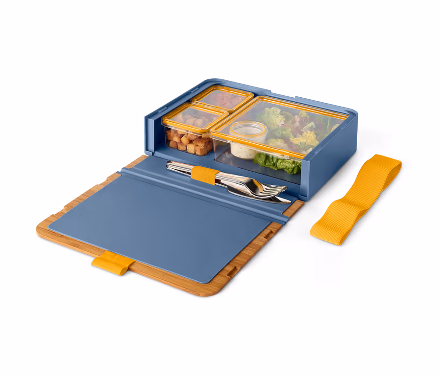 - Inkl. Lunchbox-Gehäuse, 1 großen Behälters mit innenliegendem Schraubbehälter, 2 kleiner Behälter und Besteck
