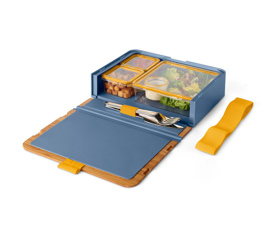 Die stylische Box hat innen einen großen Behälter, der wiederum mit einem zusätzlichen Schraubbehälter bestückt ist – ideal für Dressings, Dips oder Sauce. Die beiden kleinen Behälter ermöglichen es, weitere Zutaten oder Beilagen separat von der Hauptmahlzeit zu transportieren – oder auch den Pudding zum Nachtisch. Alle drei Behälter passen perfekt in die Box, die mit einem Magnetdeckel verschließbar ist – und Besteck ist auch schon mit dabei.