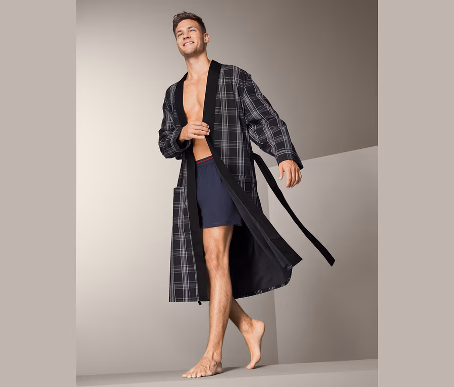 - Mit Bindegürtel und 2 aufgesetzten Taschen im klassischen Bademantelstil