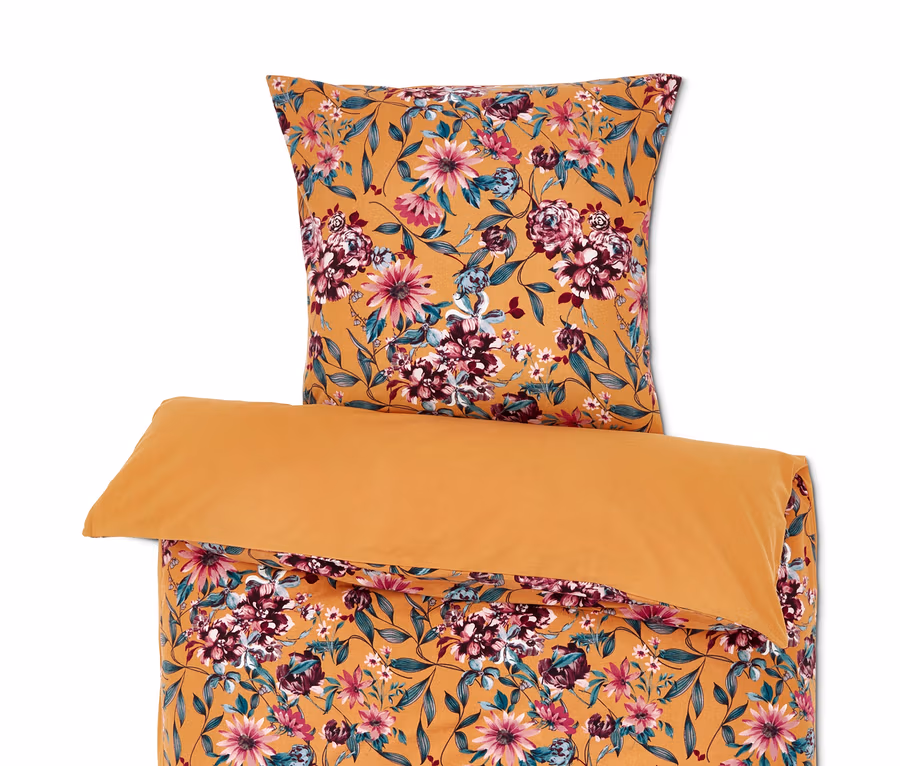 Optisch setzt die Bettwäsche im Schlafzimmer mit ihrem farbenfrohen, floralen Alloverprint auf der einen Seite einen schönen Akzent, die andere Seite ist in Gelb gehalten. Dank Reißverschluss sind Kopfkissen und Bettdecke im Handumdrehen bezogen.