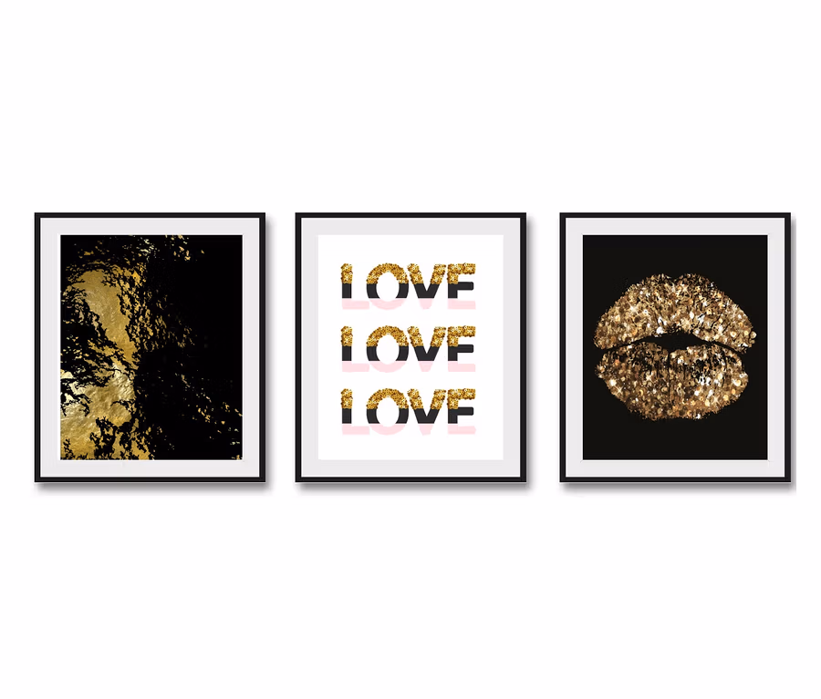 - 1x schwarz-goldfarbener Print, 1x 'Love'-Schriftzug auf weißem Hintergrund, 1x goldfarbener Lippen-Print auf schwarzem Hintergrund
