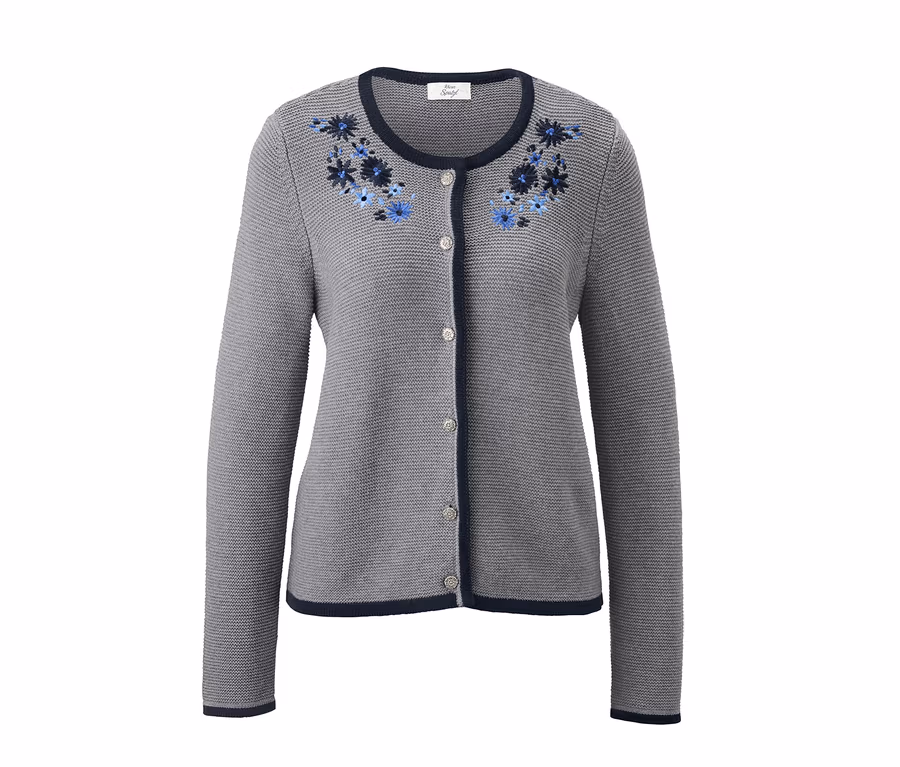 Diese aus weicher Baumwoll-Mischqualität gefertigte Strickjacke trägt sich nicht nur angenehm auf der Haut, sie wird vor allem auch durch die dekorative Blumenstickerei auf der Vorderseite zum Hingucker – und das nicht nur auf der Wiesn!