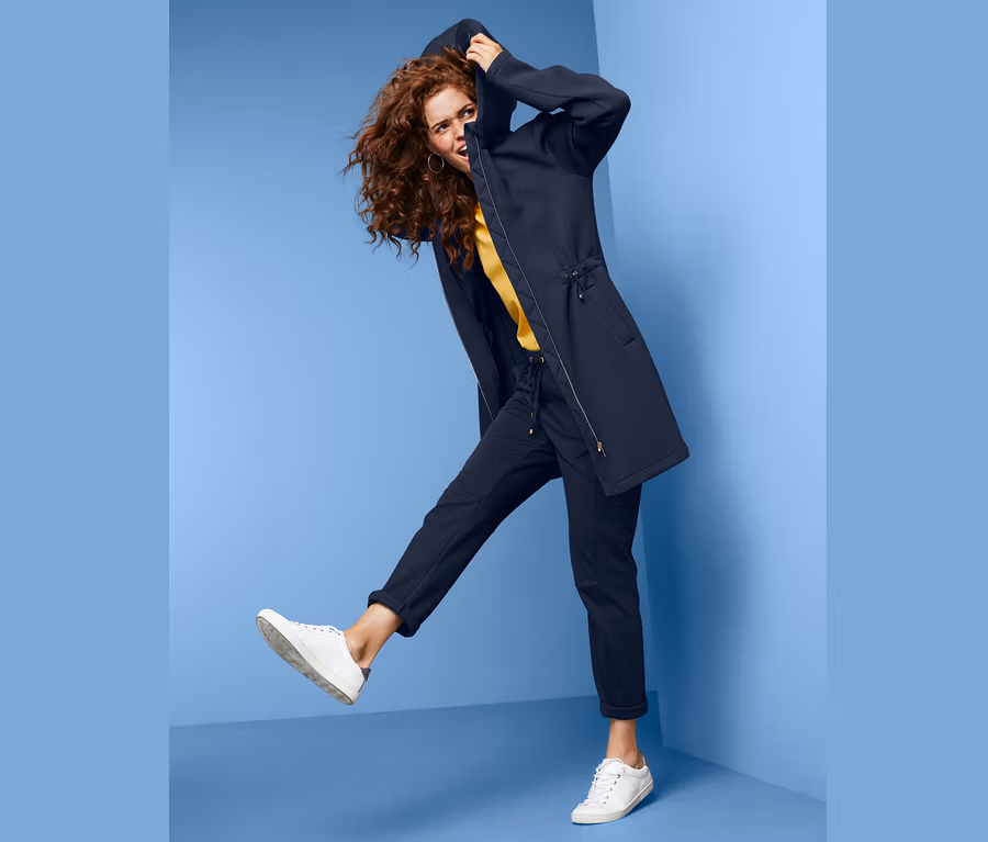 Dieser Kapuzen-Sweatmantel aus besonders leichtem und atmungsaktivem Material lädt draußen zum Wohlfühlen ein. Goldfarbene Details schmücken den feminin geschnittenen Mantel, der sich in der Taille zusätzlich anpassen lässt. Dank der Kapuze kann man Wind und Wetter trotzen und jede Outdoortätigkeit schick gekleidet genießen. Der Kinnschutz am Reißverschluss sorgt für zusätzlichen Komfort. Zwei Eingrifftaschen bieten praktische Aufbewahrungsmöglichkeiten und setzen, wie die Teilungsnaht im Rücken, einen modischen Akzent. Die ungefütterte Sweatjacke enthält Elasthan und kann so in jeder Situation Formbeständigkeit und einen perfekten Sitz garantieren.