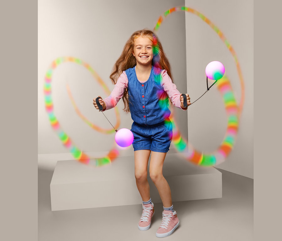 - Erzeugt bunte Lichteffekte durch raffiniertes Jonglieren