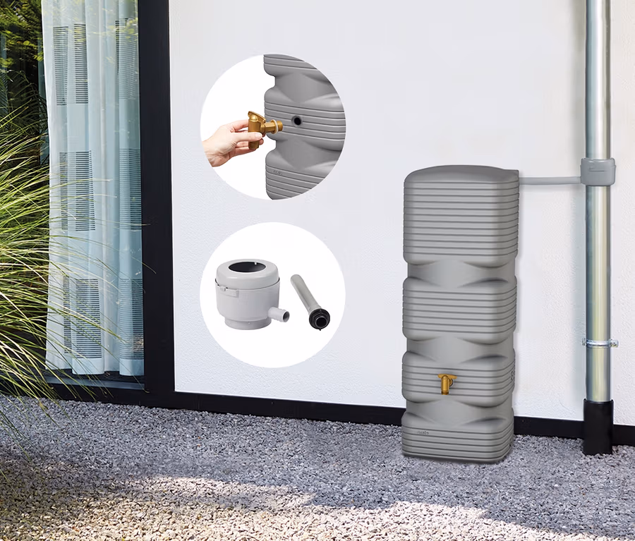 - Inkl. Regentonne, Kunststoff-Auslaufhahn Aqua-Quick, Fallrohrfilter, Füllautomat inkl. Filtereinsatz, Verbindungsschlauch (25 cm) und Zulaufdichtung DN19/32